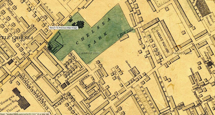 Left: Chelsea Park on Greenwood’s 1827 map. Right: Chelsea in 1862, from Stanford’s map