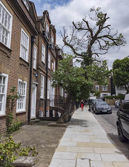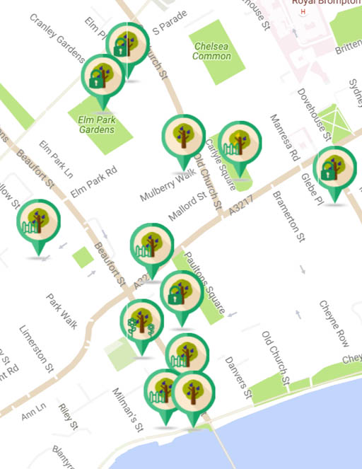 All that remains today are a few street names, including Chelsea Park Gardens and Mulberry walk. It seems very likely, though, that the old, recumbent mulberry in Elm Park Gardens (east side) – and perhaps some of its neighbours in nearby gardens -- has survived as a reminder of John Appletree’s original venture 300 years ago, when it was just one of 2,000 trees.