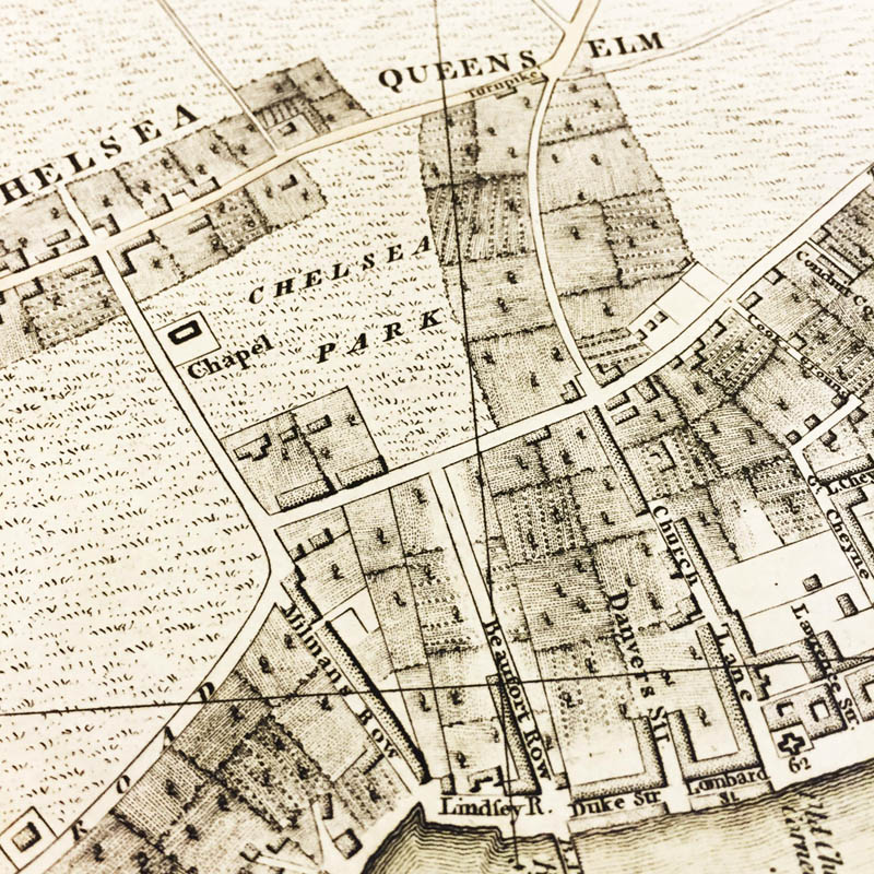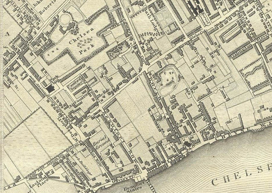 Left: Chelsea in 1746, from John Rocque’s map of London. Right: Cary’s 1799 map of Chelsea.