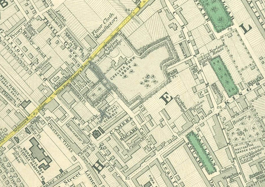 On November 24, 1875 The Times published a letter by a young medical student at St George’s Hospital, Frederic Dawtrey Drewett, protesting at plans to build on Chelsea Park. “Through its old iron gates,” he was to reminisce, nearly fifty years later, now a distinguished retired surgeon and author, “which opened onto the Fulham Road opposite […] could be seen a park of cedars, old mulberry trees, elms and whitethorn, full of blossom in the spring, all set in long grass – more like the country than any London suburb.”2