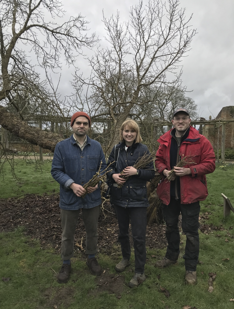So it was, at the end of February – during the mulberry’s dormant season – that Morus Londinium organised a historic meeting by the mulberry, hosted by Andrew Turvey, on behalf of the 7th Marchioness of Salisbury, who dropped by to say ‘hello’. Taking cuttings alongside Andrew and horticulturist Adam Norris, were Matt Collins, Head Gardener at the Garden Museum and horticultural trainee, Amy Thompson. Peter Oakenfull, valued consultant to the Hatfield Estate and a living archive of arboriculture experience, was also on hand.